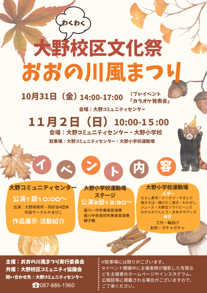 「令和7年度大野校区文化祭 おおの川風まつり」を開催します! 投稿日 2025年10月27日 著者 大野コミュニティセンター カテゴリー お知らせ 今年は、大野コミュニティセンターと大野小学校運動場の2会場で開催します。皆さまのお越しをお待ちしております。